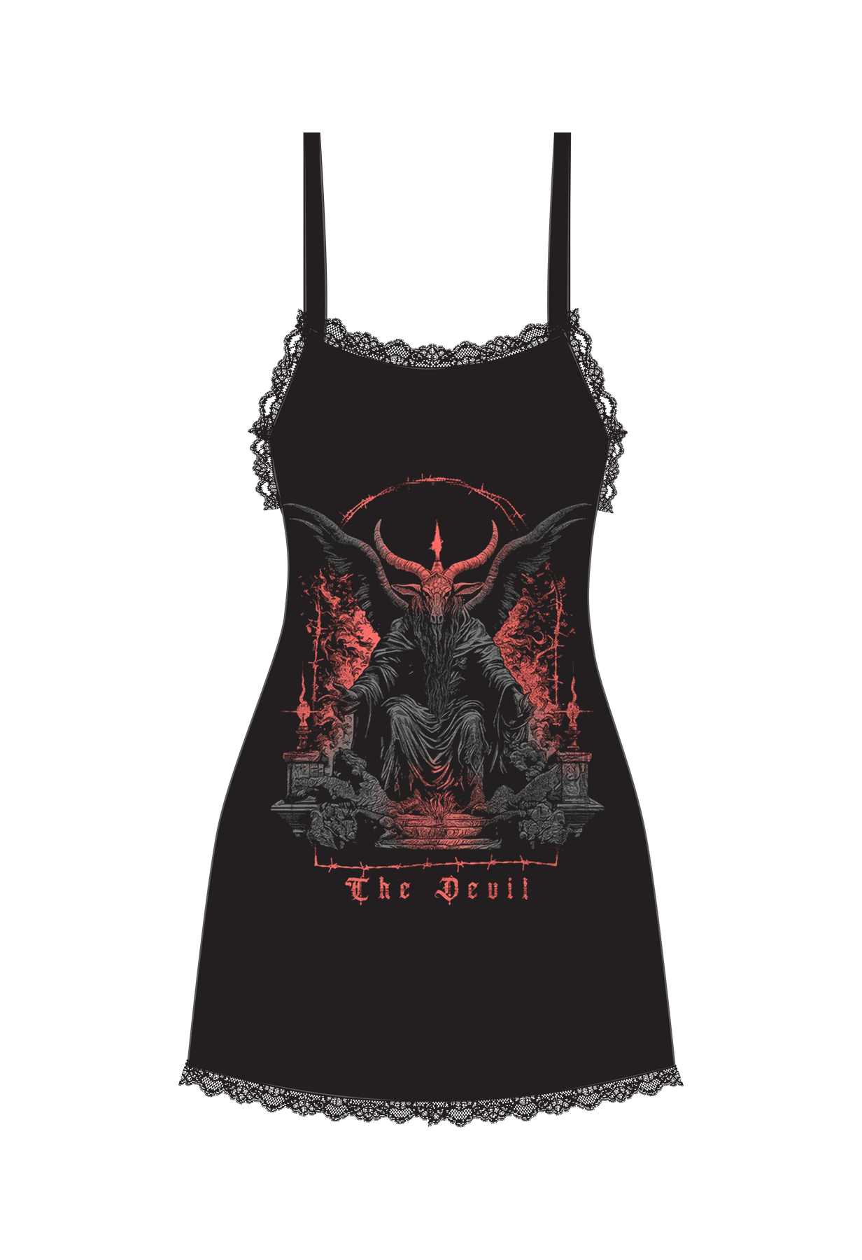 A soft and stretchy slip dress cut in a slim fit with the perfect mini length. Featuring lace-trimmed detail and adjustable spaghetti straps. With custom Devil artwork on the front.
