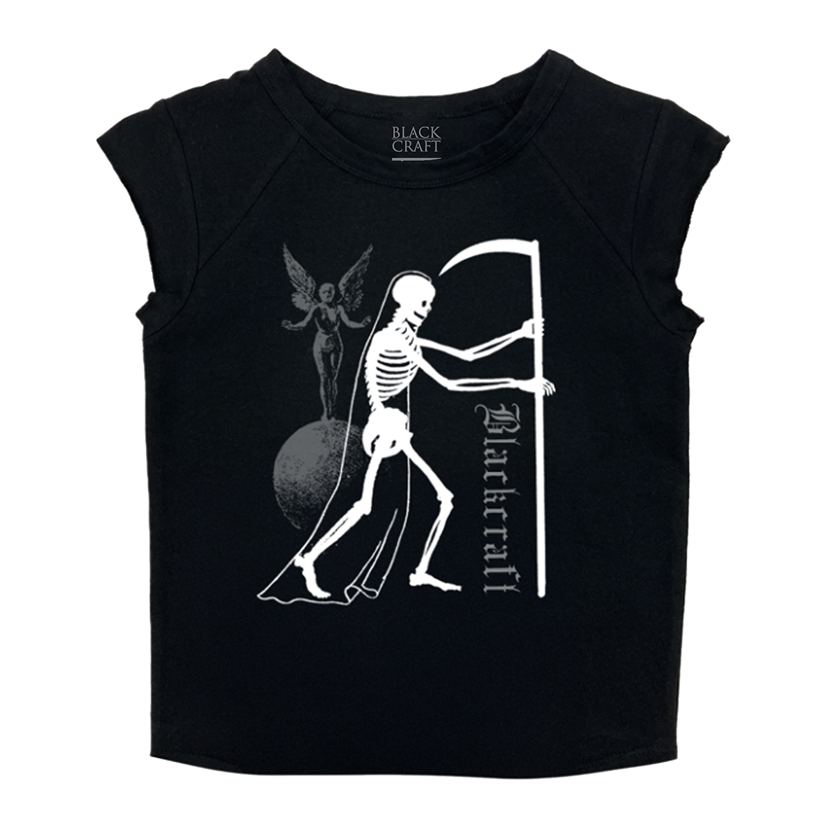A slim fit cropped tee made with a stretchy cotton/spandex blend. Featuring custom Skeleton Reaper artwork across the front.