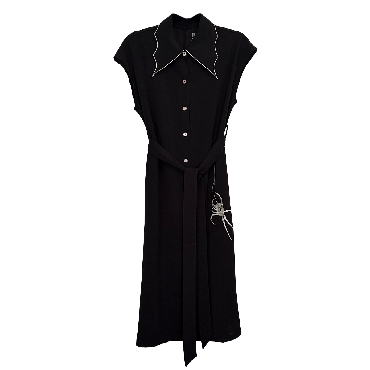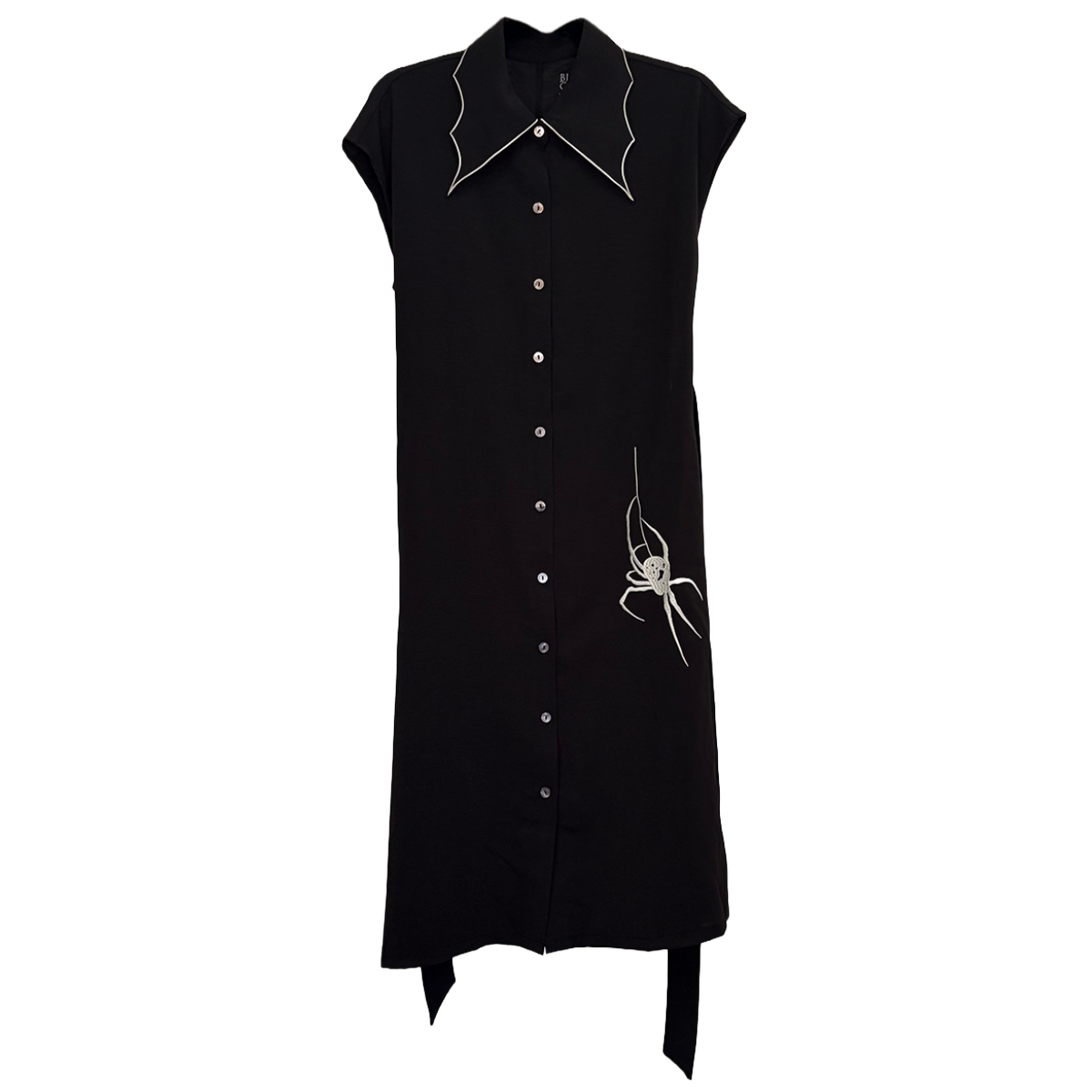 A gothic take on the classic shirt dress. This lightweight midi dress features a cobweb-inspired collar with contrast trim, a button front, and an adjustable waist tie. Pairs well with our Widowed Hat.