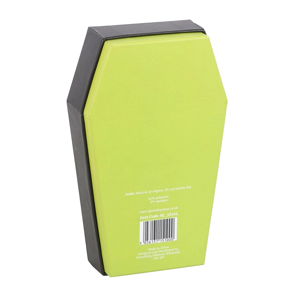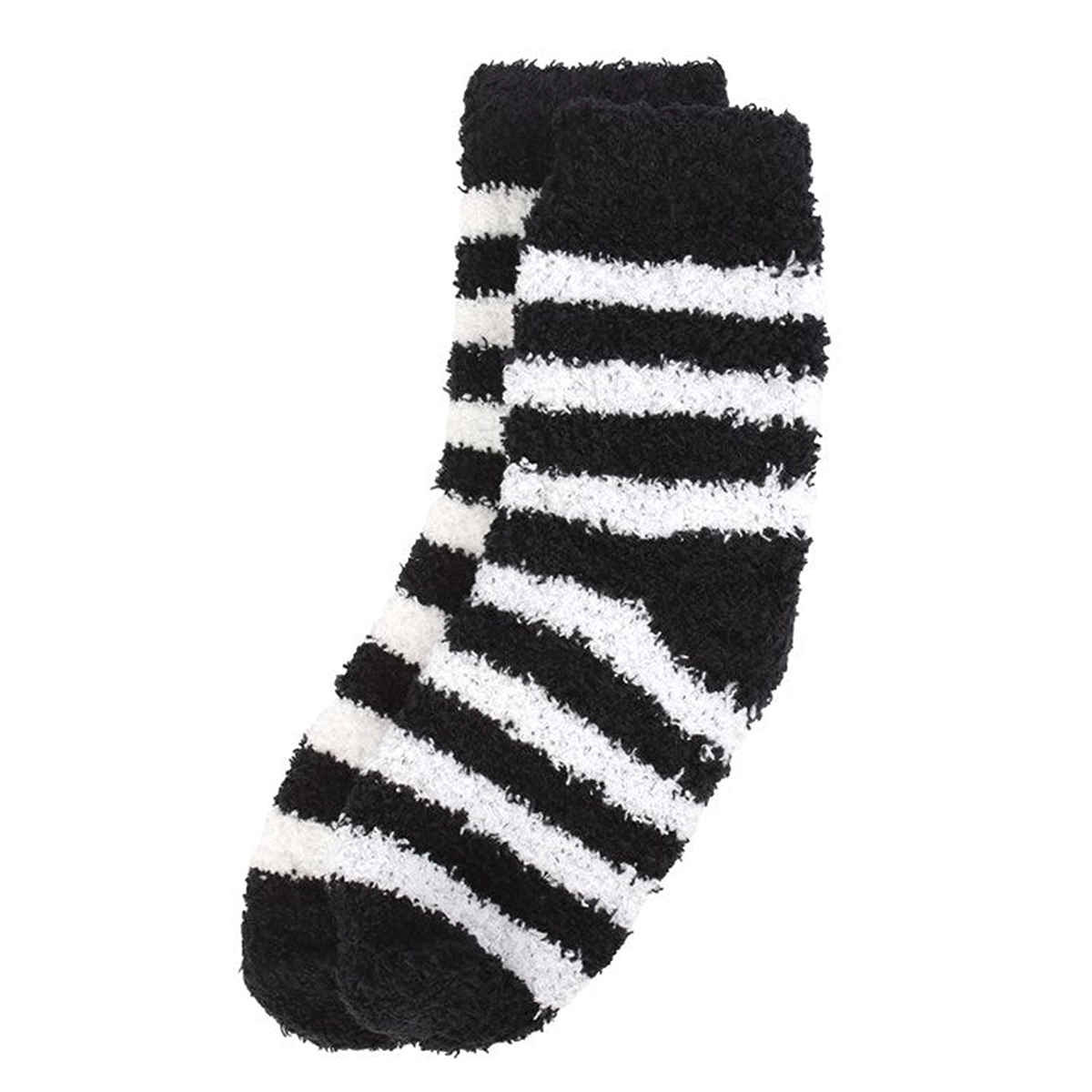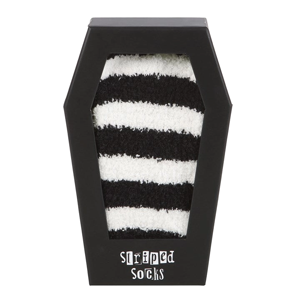 Treat your feet to these soft and fluffy socks in a black and white striped design. Packaged in a coffin-shaped gift box, they make the perfect gift item.