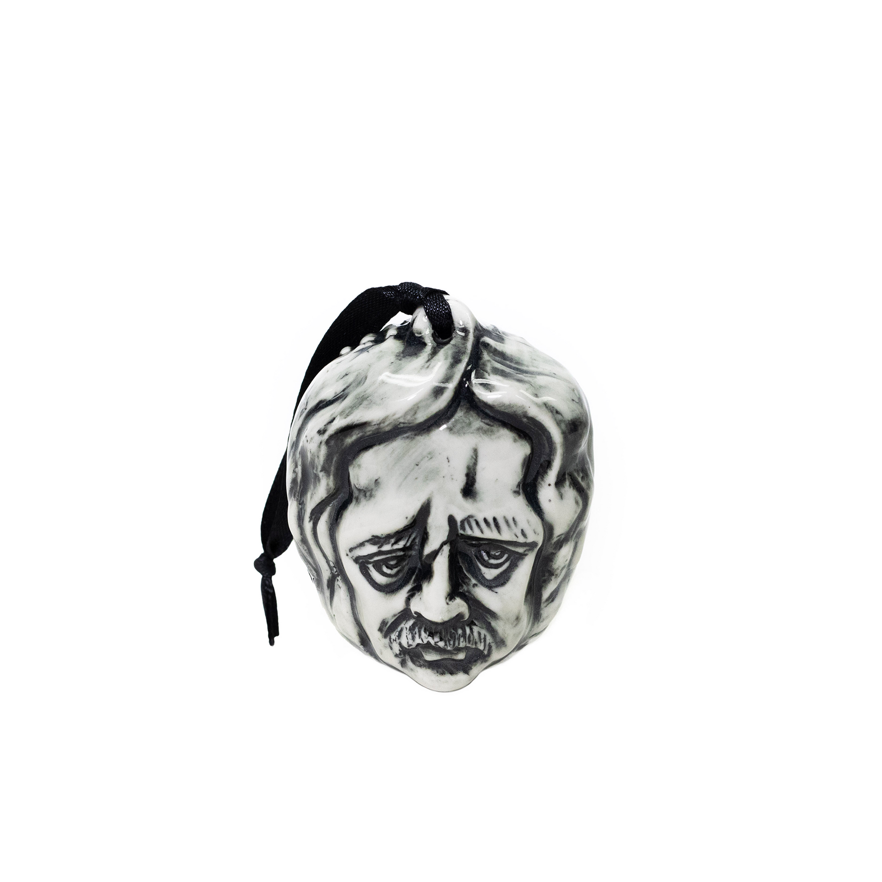 A ceramic Christmas tree ornament in the shape of Edgar Allen Poe's head.