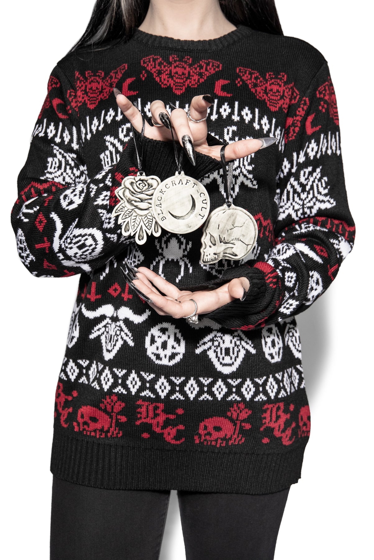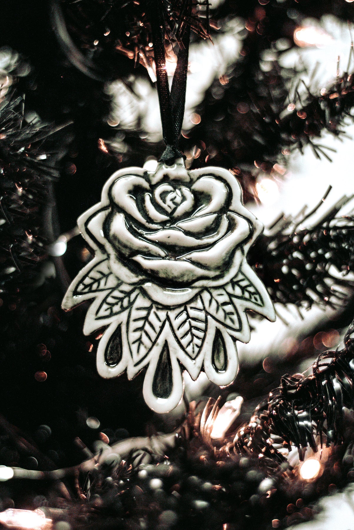 A 3-piece ceramic Christmas tree ornament set. With skull, moon, and rose ornaments.