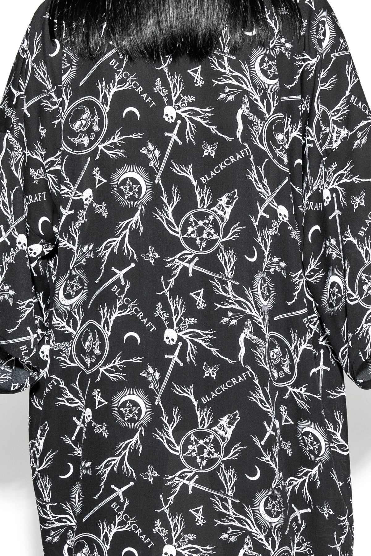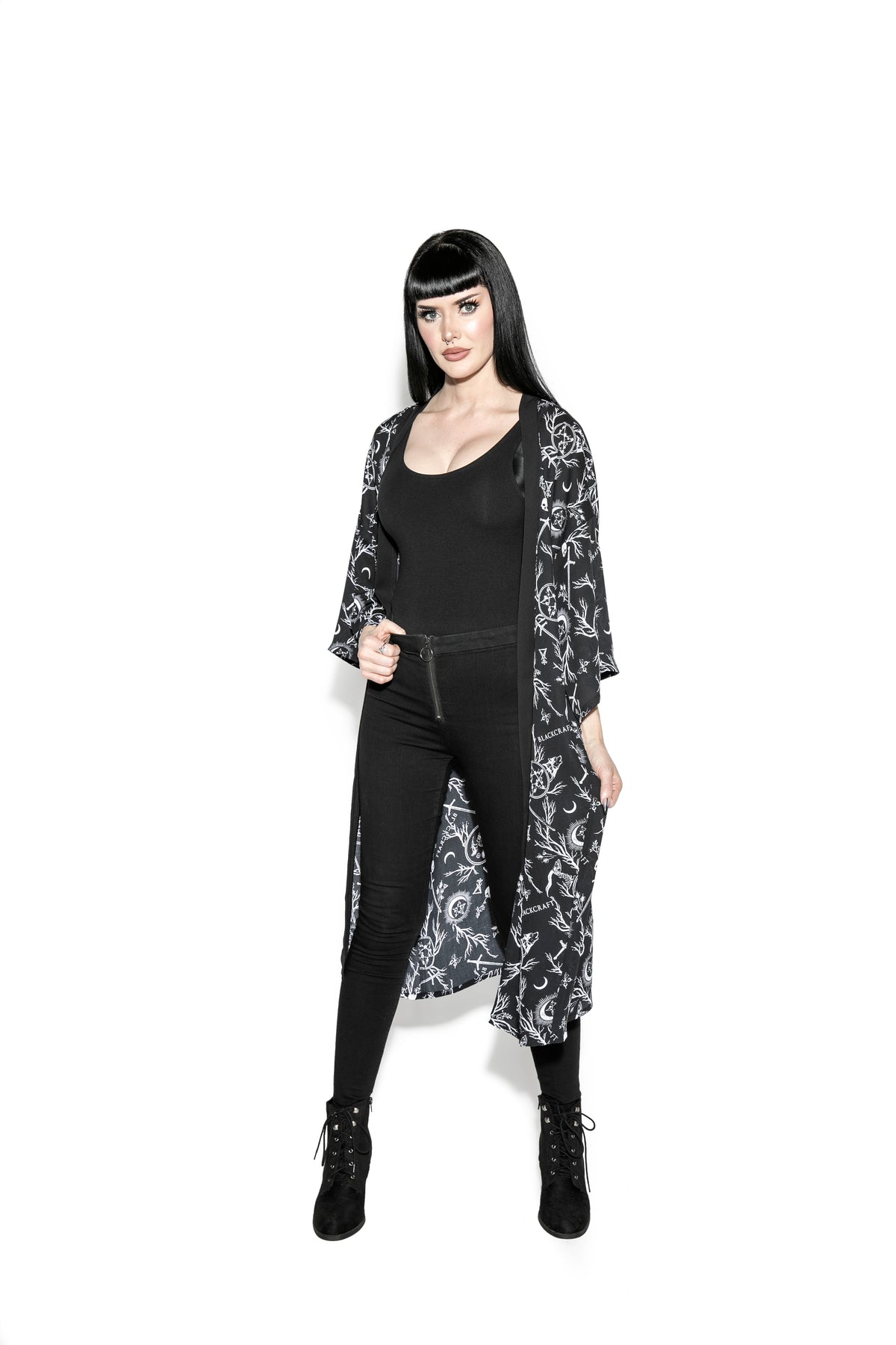 A flowy oversized kimono designed in an allover Demons print. With an open front and long duster length. The perfect poolside cover-up or lightweight layer.