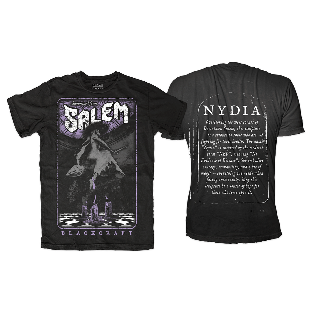 At our grand opening ceremony, we honored her with the dedication of our larger-than-life witch figure, Nydia. Nydia's significance, deeply personal to her, was unveiled with a plaque for all our customers to see. It serves as a reminder of her courage and determination in the face of adversity. The back of the tee shirt features the plaque that stands beside Nydia in Salem today. The color lavender represents those living with all types of cancer.