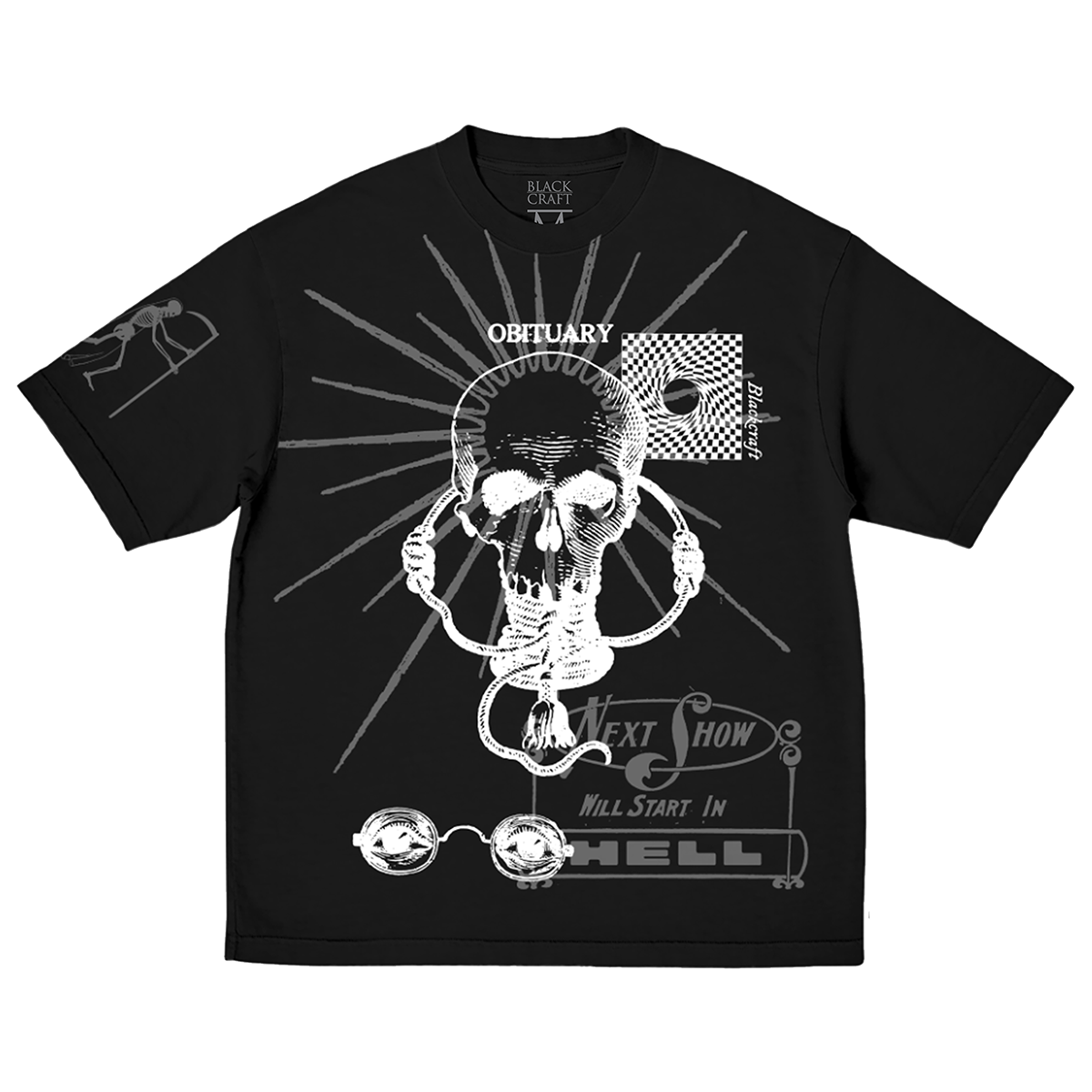 A heavyweight, oversized tee made with a soft cotton / poly blend. Featuring custom oversized artwork on the front and a skeleton reaper design on the right sleeve.