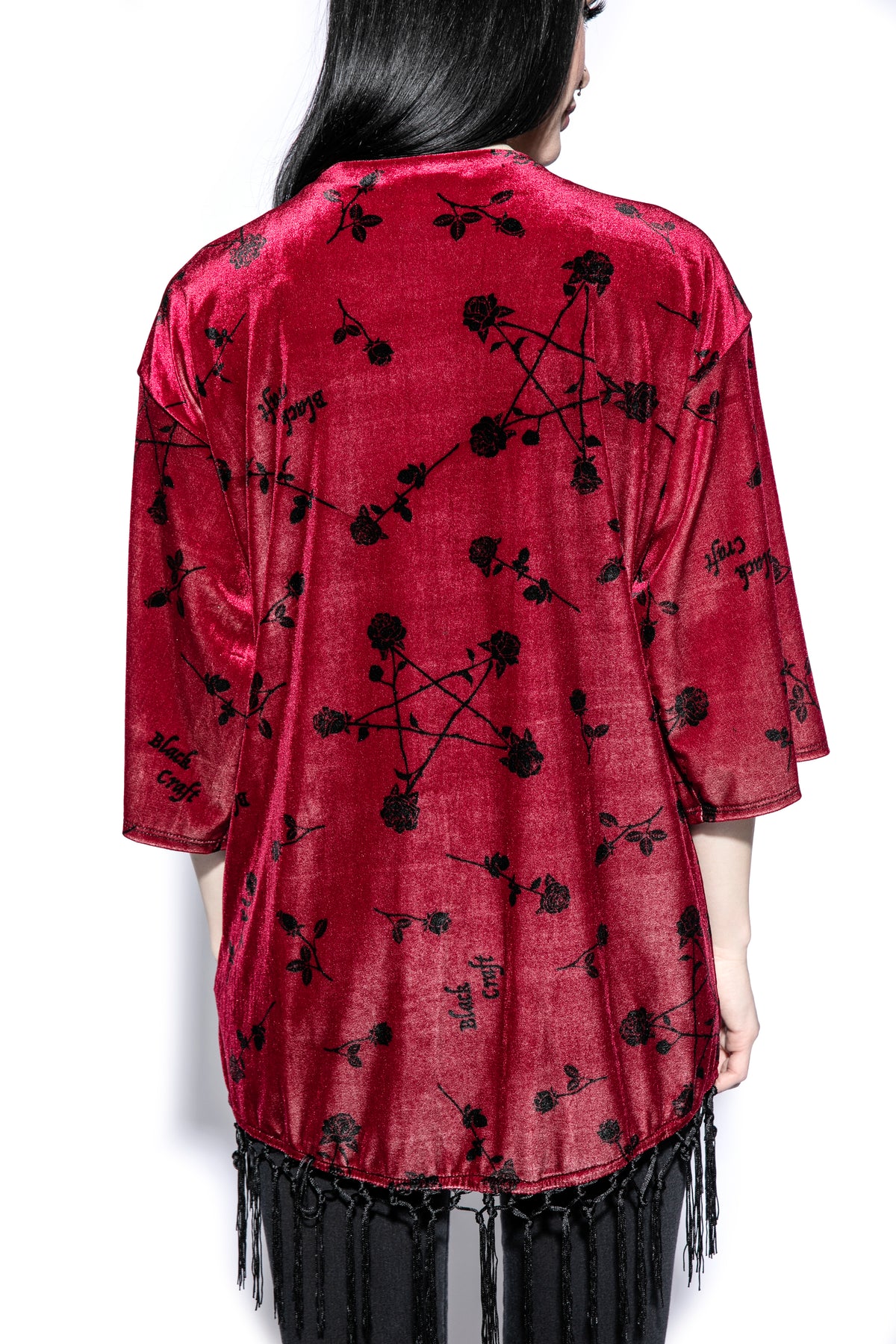 A flowy oversized kimono designed in ultra soft velvet. With a fringed trim and an open front. The perfect lightweight layer.